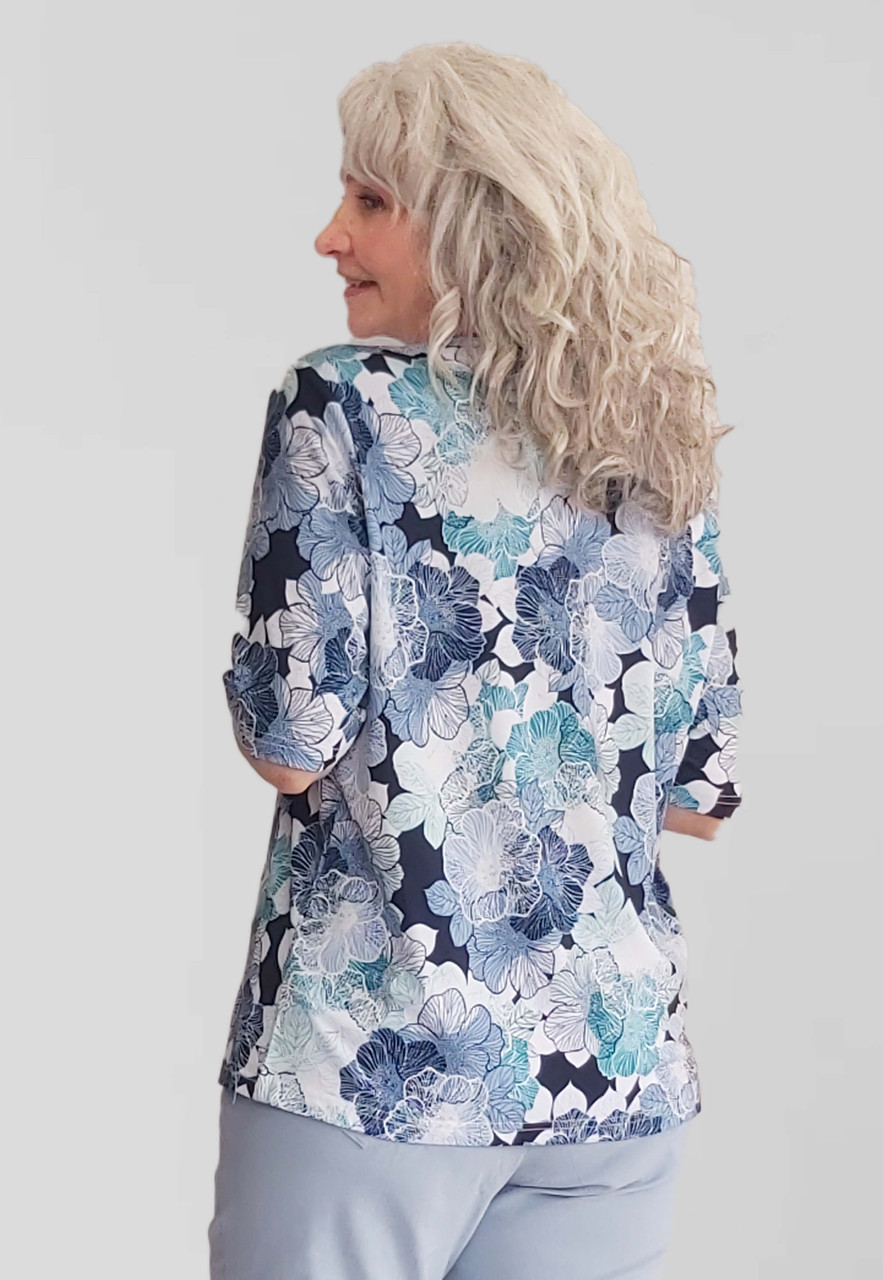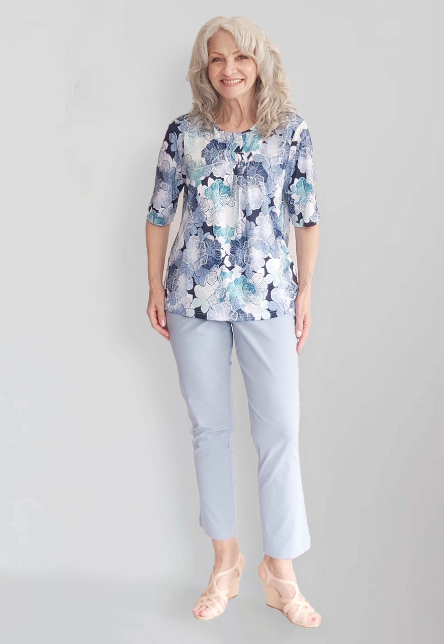 Embrace effortless charm with our Blossom top. Its lovely sky blue and white floral print adds a touch of spring to your day. The design includes a classic round neckline and comfortable elbow length sleeves. Slight gathering on the center front allows for extra drape and a flattering fit. Designed for both comfort and style. Pair it with our chambray chi-chi pants or classic white or navy slacks for a cheerful, polished look. GG xx