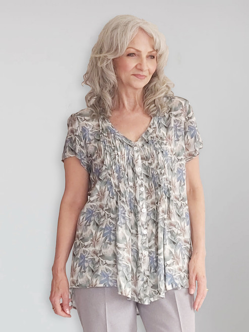 This exquisite shirt showcases a stunning abstract floral design on soft, lightweight woven fabric. The pintucking detail at the front and back gracefully flows to the waist, adding a touch of sophistication. It pairs perfectly with our Jillian silver grey, Chi Chi sky blue pants or looks equally fabulous with jeans. Made from 100% Rayon, it offers an effortless blend of elegance and comfort. GG xx