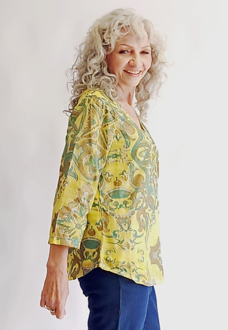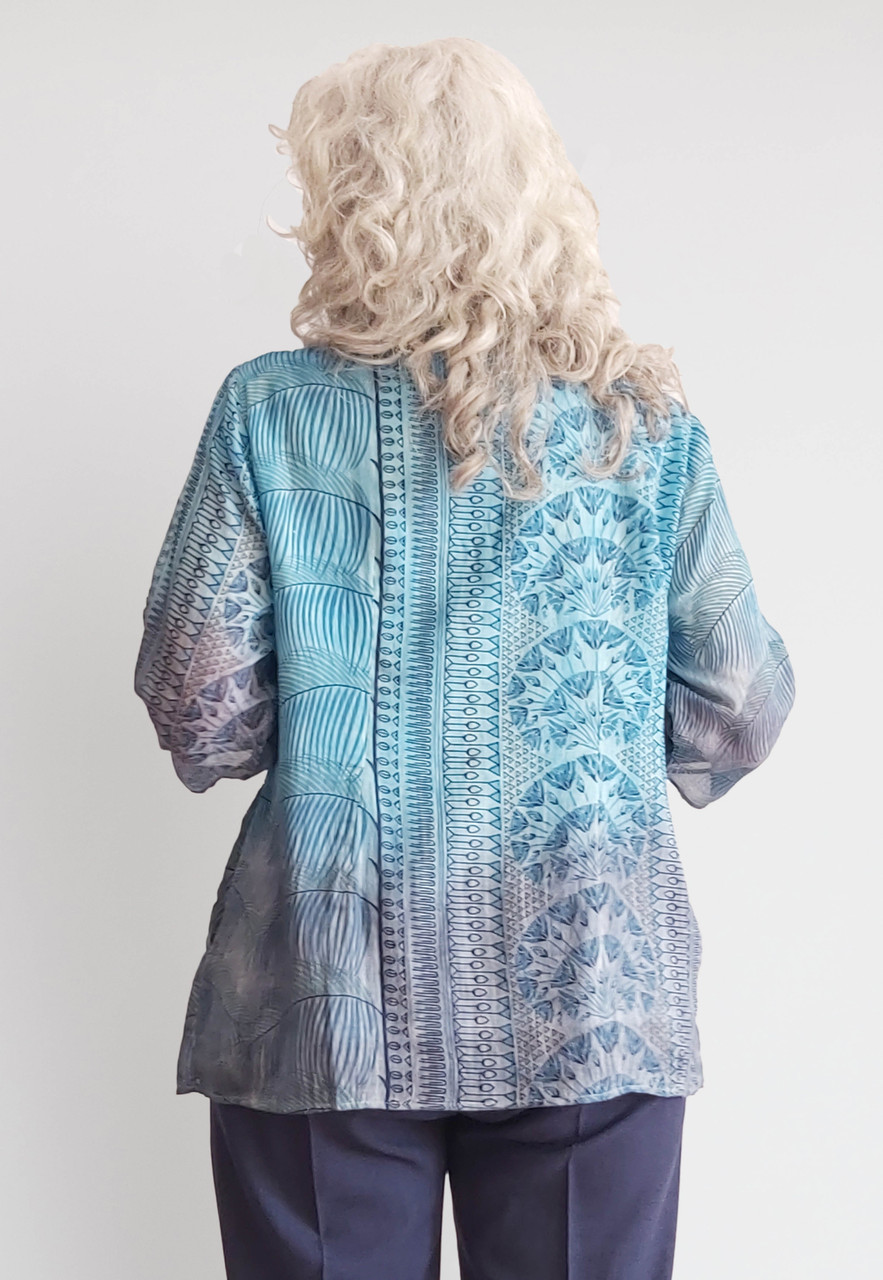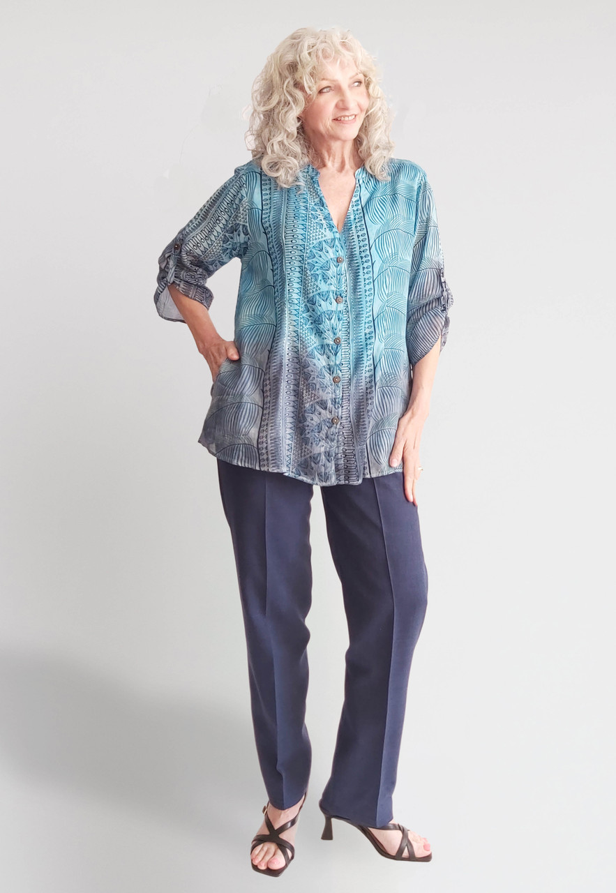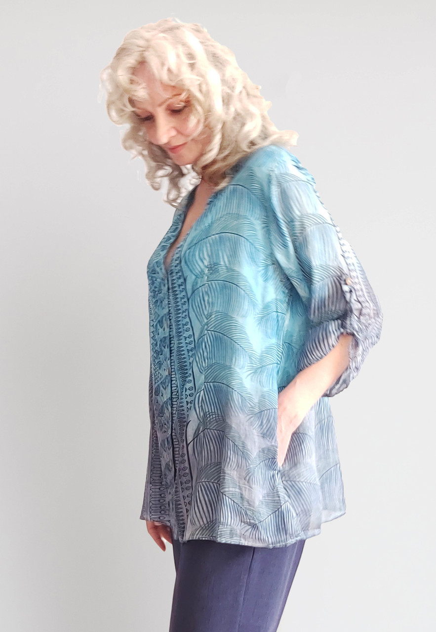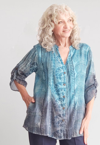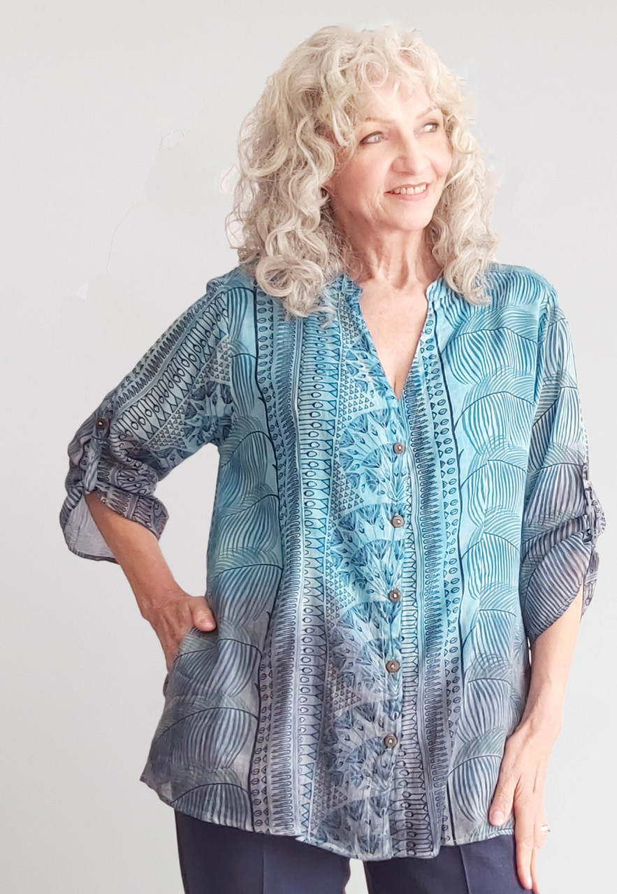 Dive into the serene beauty of our Mystique Lagoon tunic top. This unique style features a stunning hand-block printed design in shades of blue, transitioning from aqua to rich indigo. Made from 100% cotton, this lightweight and breathable button-through style is ideal for a relaxed day out or a luxurious resort getaway. GG xx