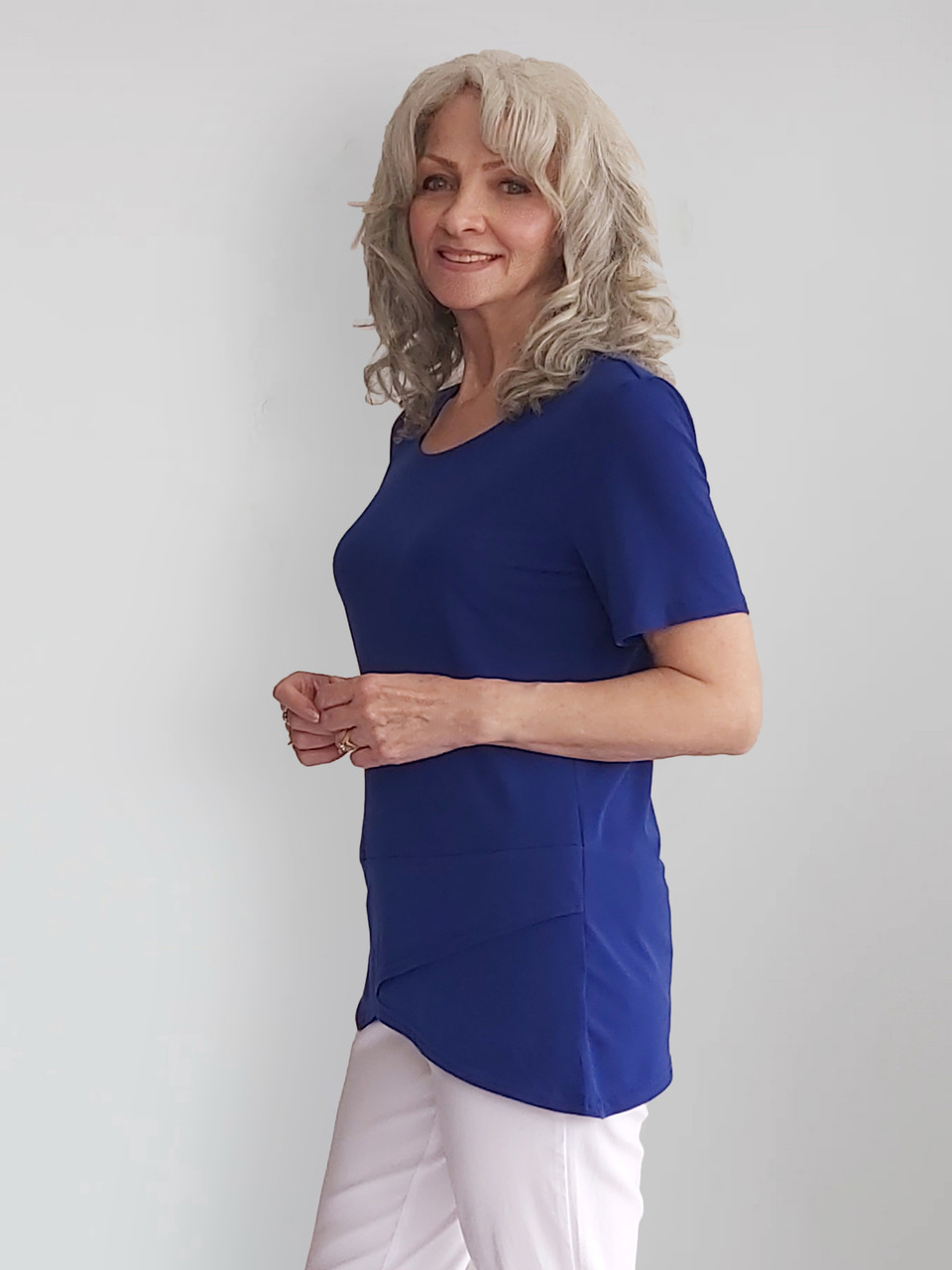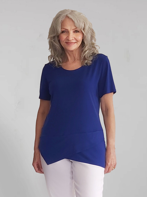 The Jersey Z line top from Golden Girl is indeed a standout piece! Its round neck and short sleeves offer a classic look, while the asymmetrical hem feature adds a modern twist. The jersey fabric ensures comfort and a flattering fit. This striking sapphire blue colour suits many skin tones and is a versatile choice for day or night wear. GG xx.