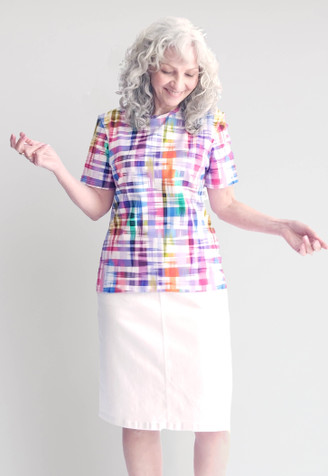 Our vibrant Golden Girl top is a burst of joy. Featuring a playful multi-coloured crosshatch print that's sure to brighten any day. This eye-catching Australian Made top will add a pop of personality to your wardrobe. It's ready to bring smiles wherever...