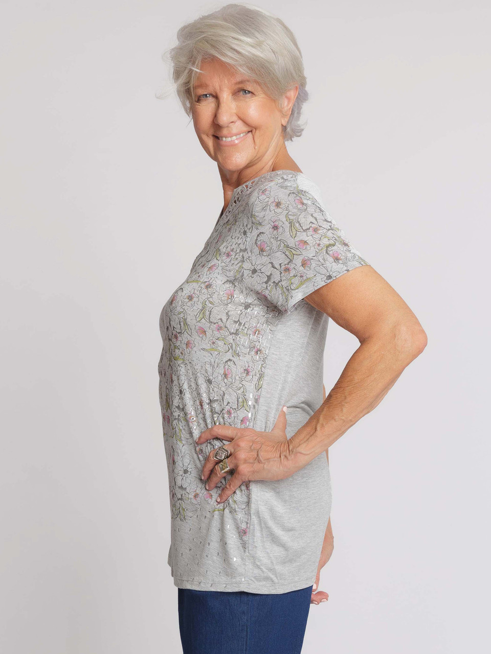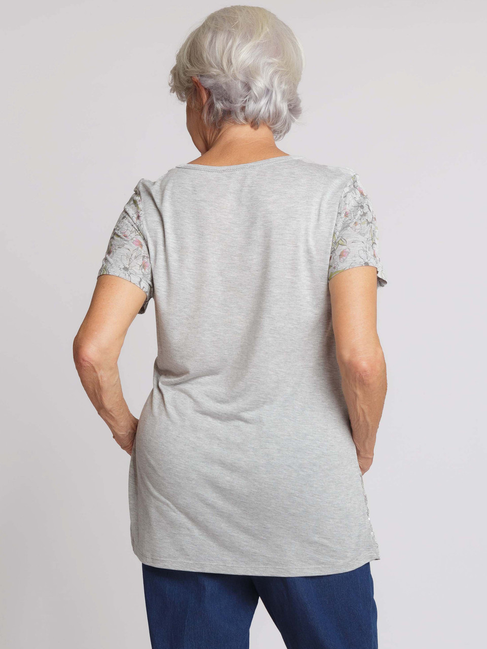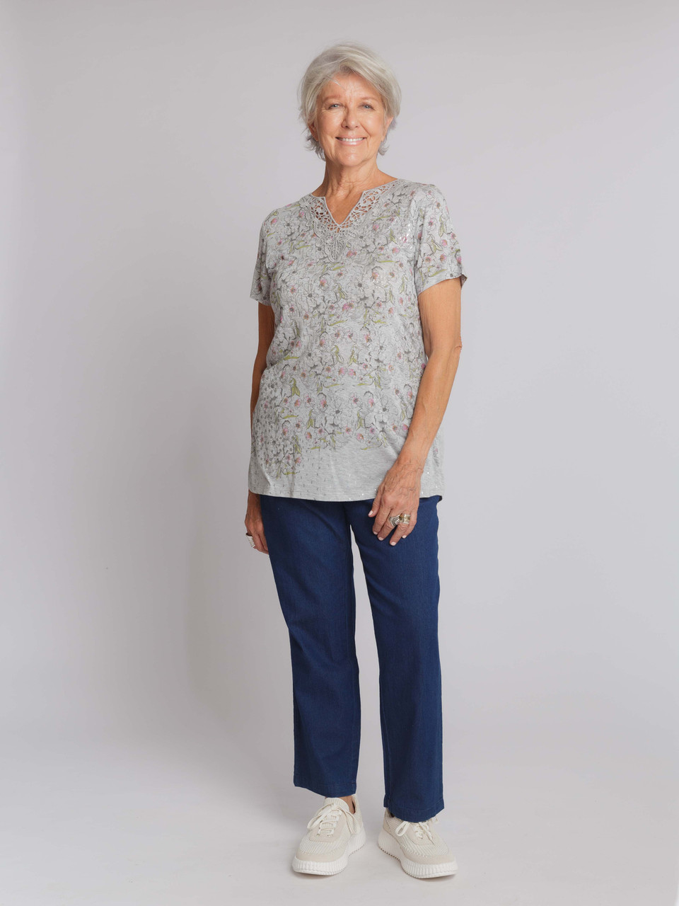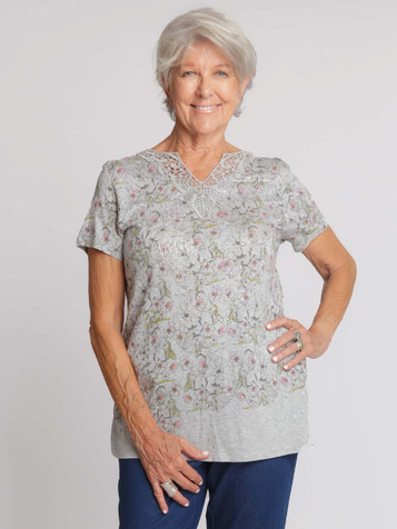A neutral palette with a floral design. This feminine top features a delicate floral printed front and broderie v neck trim. It is extremely unique and will become a very special piece in your wardbrobe. GG xx