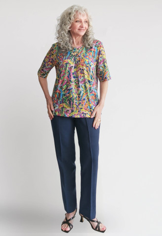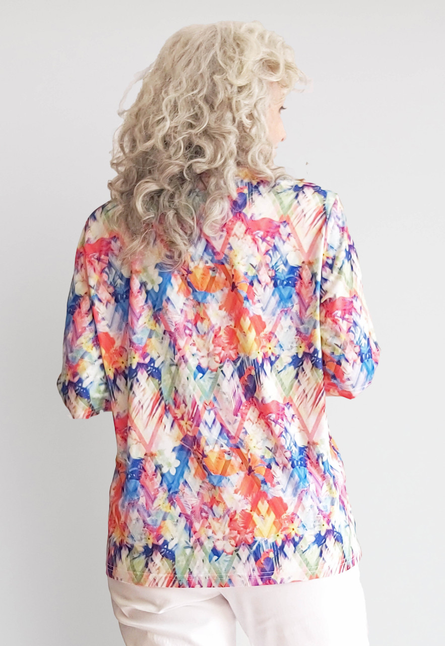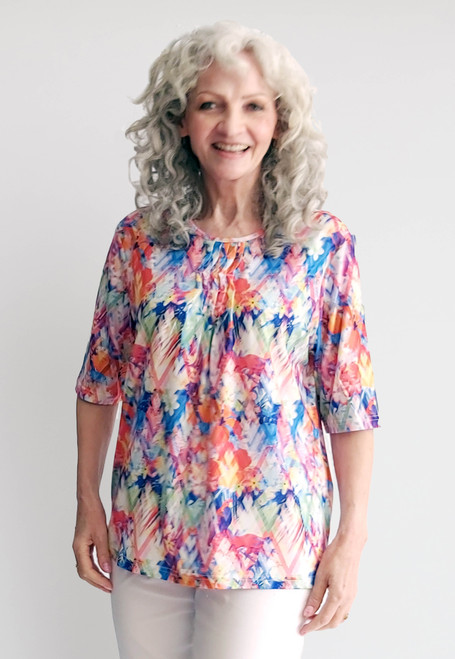 This Spectra top features an uplifting and energetic abstract print, perfect for those who like a pop of colour. It features a round neckline, gathered detail at the center front, elbow-length sleeves, and a relaxed silhouette, making it perfect for various occasions. GG xx.
